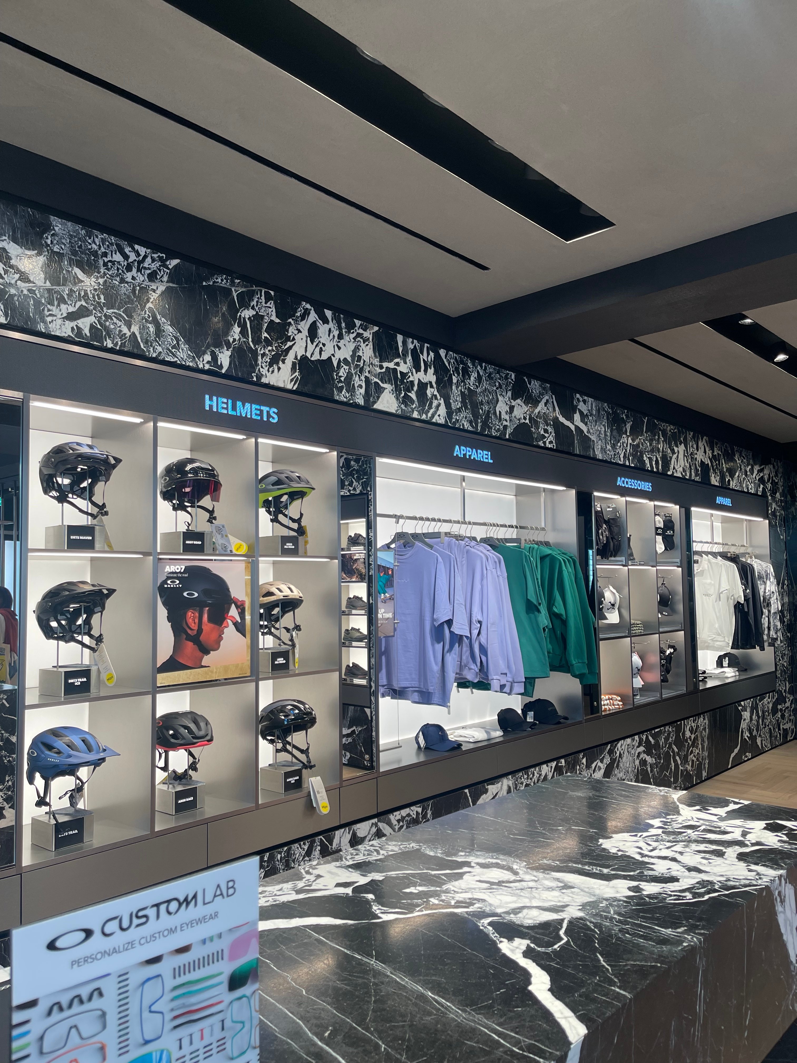 Oakley is enhancing the retail experience with Covent Garden’s sleek, tech-forward approach to their latest renovation in their latest flagship Covent Garden store. Their diverse product range is supported by a clear communication hierarchy and a digital ticker that keeps customers informed and engaged. Eye-catching pops of yellow combined with an interactive touch screen display in the entrance way, both attracts and excites, encouraging you to browse the newest product drop before committing to go further.