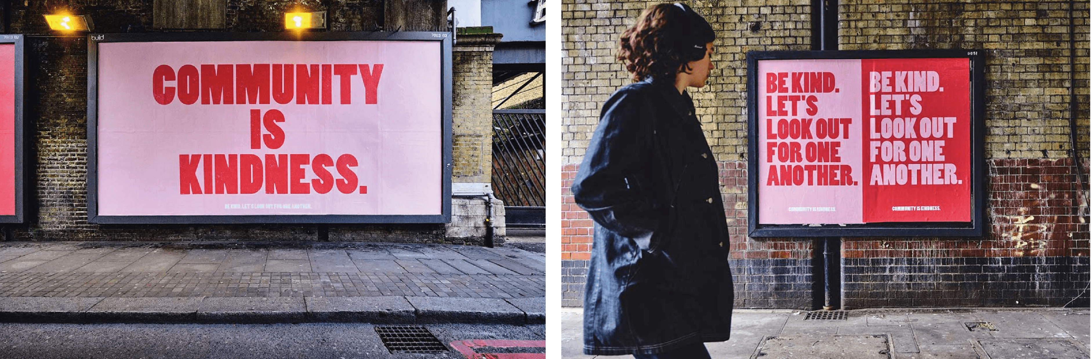 ‘Community is kindness’ billboards appeared around Loughborough Junction in Brixton, created by out-of-home agency Jack Arts. The campaign was put out as a positive gesture by the team and appeared across 10 cities in the UK and then picked up in the media before landing across the world in Australia, New Zealand, Canada and USA. The posters were also made downloadable to print at home and put in windows to keep spirits high.
