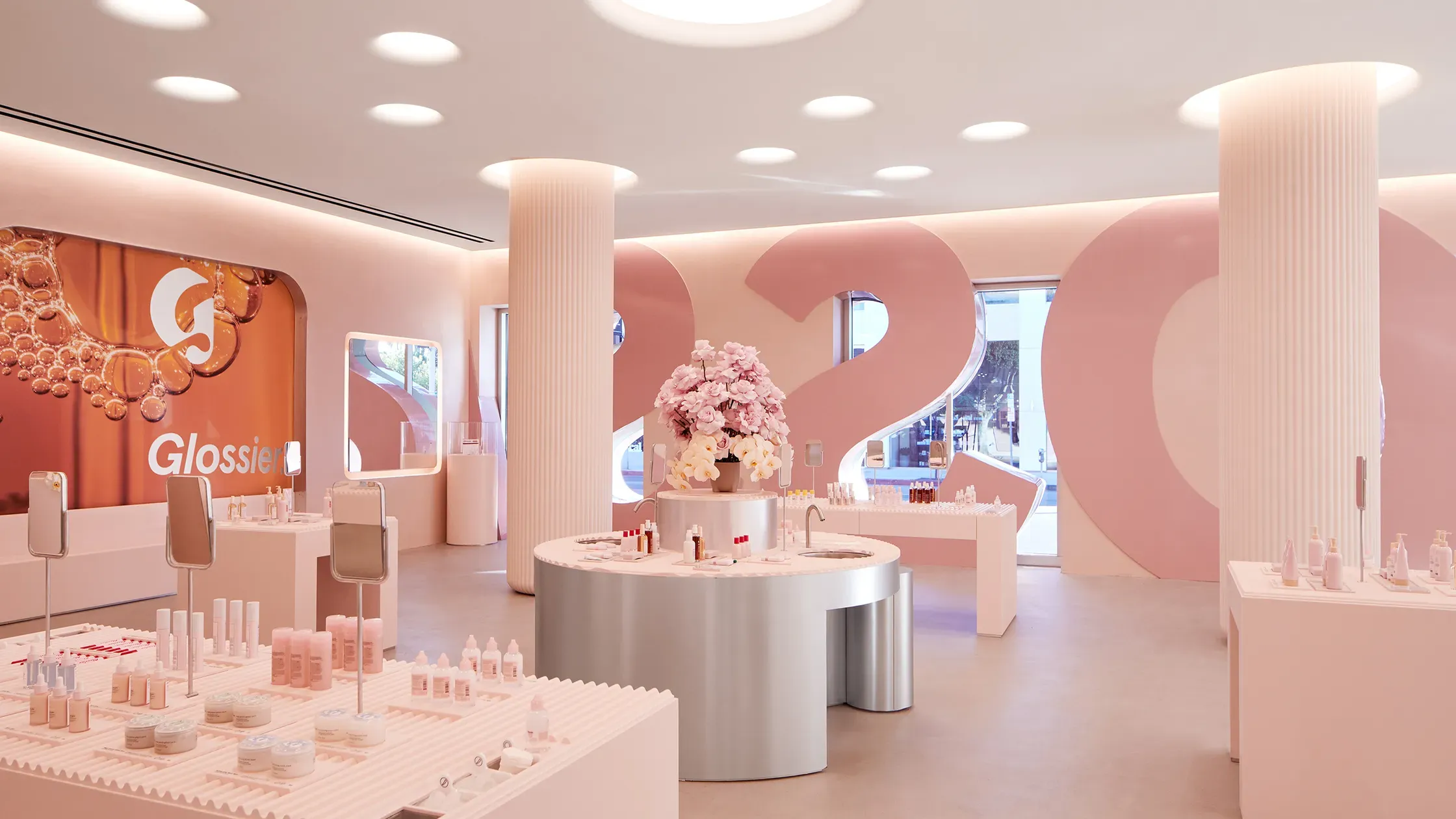 Beauty brand Glossier created a world of pink from their iconic shade, from marble surfaces to the products themselves it features everywhere, making it an iconic destination for many. Their LA store also features a giant brand logo spread across the pink exterior, making it clear that some brands definitely aren’t afraid of being bold.