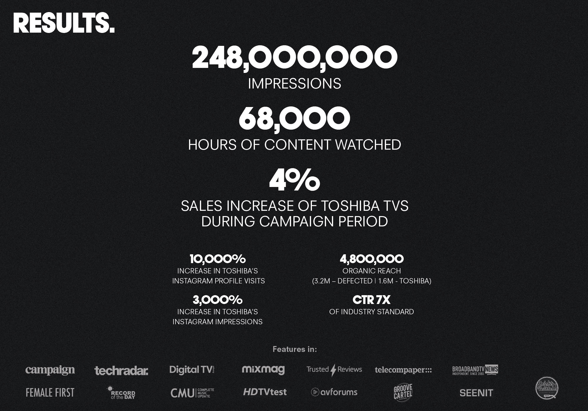 The awareness campaign evolved as the campaign did. It helped create hype before the festival, it drove up live viewership during the festival, and it made sure the views still kept on climbing after the festival for all those wanting to relive the action vicariously. We used social extensively and across multiple accounts between both Defected’s and Toshiba’s online families. This allowed us to build interest in what was happening at the festival, while also offering an easy way to tune in. A large percentage of the impressions were organic across both brands, showing the global appetite for this kind of content (and that people were ready to celebrate the ‘end’ of lockdown).