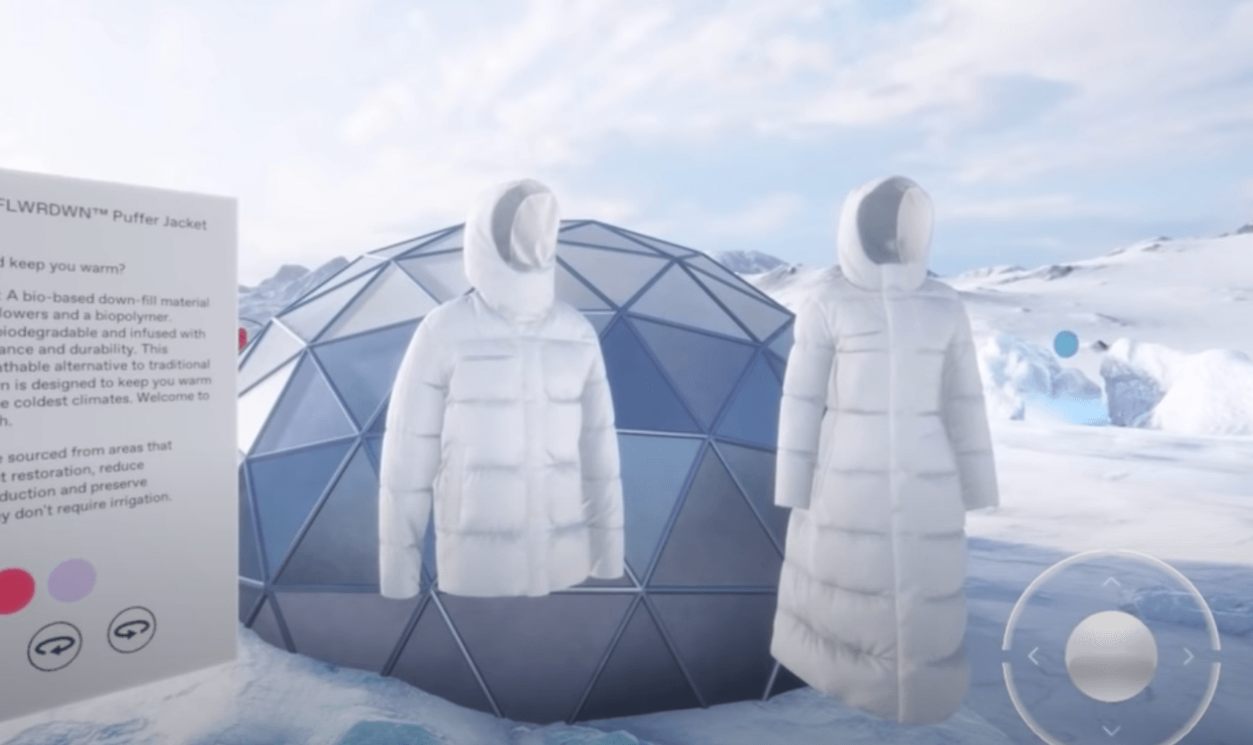 It-brand Pangaia offer another great example, their virtual world created to showcase their eco- ethical Flwrdwn puffer jackets is set in an Antarctic landscape. Using their mouse to navigate, users could roam the landscape to examine the virtual Pangaia garments, accompanied by a synchronised soundtrack of whistling wind and snow underfoot.