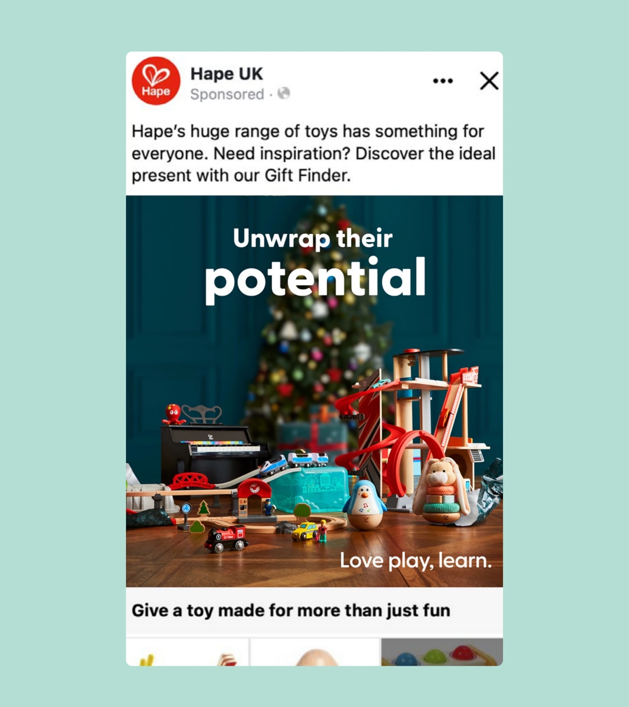 We designed an end-to-end digital brand presence, establishing a robust analytics framework, digital platform onboarding and media performance activation. Our approach enabled Hape to launch brand and sales focused campaigns, direct to consumer, for the first time. This included the creation of a messaging matrix, dynamic targeting, tracking shopper behaviours, and the development of a proprietary gift-finder website tool. We strategically leveraged these assets through digital advertising, social commerce, and Google search & shopping.