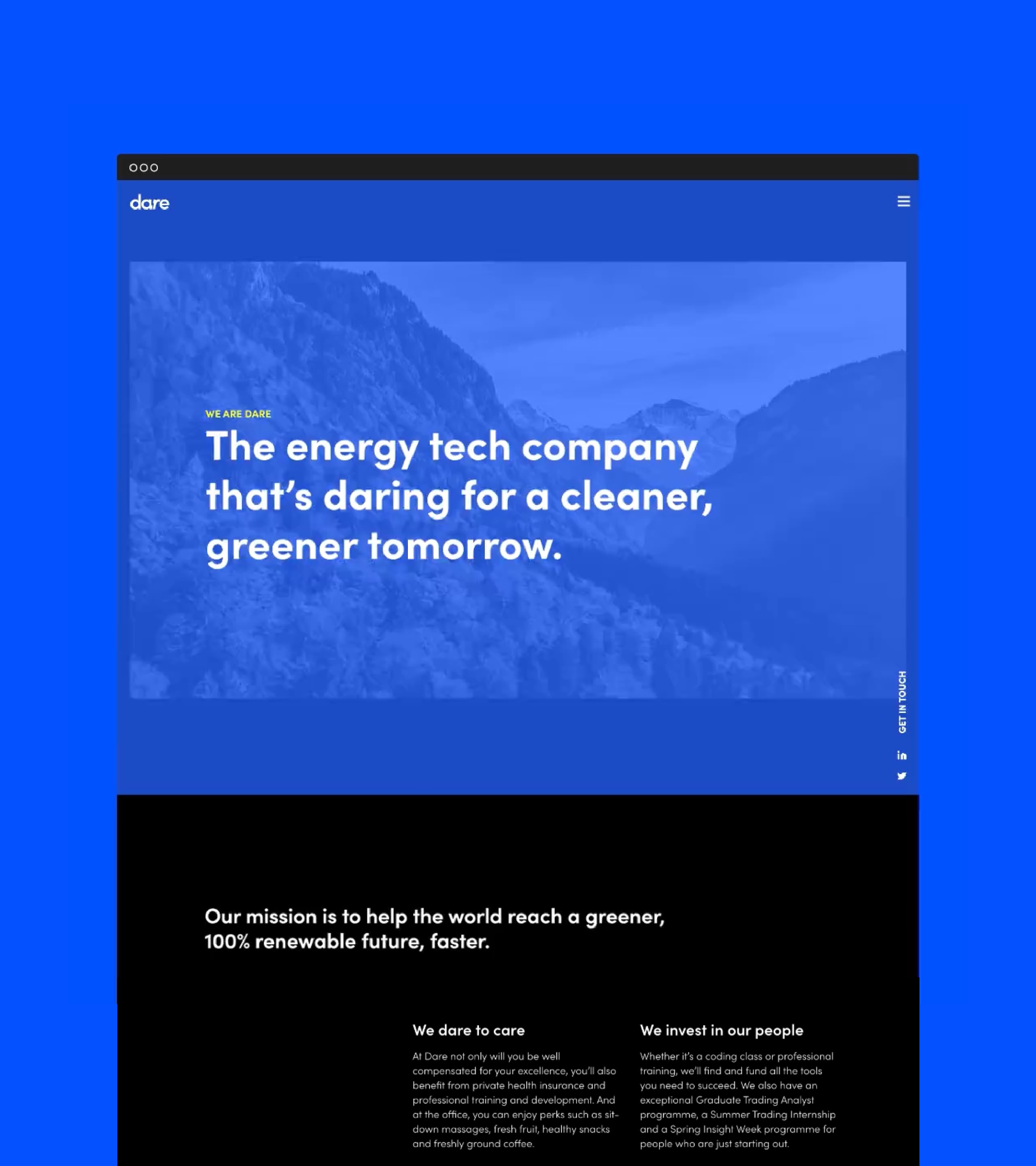 Shifting away from commodity trading to focus on renewable energy trading as part of a JV partner buyout, the company VCMT became Dare. Following the name change, Dare needed fundamental and ambitious changes to their brand. The new owners tasked The One Off with redefining their positioning and to give new meaning to their new name.