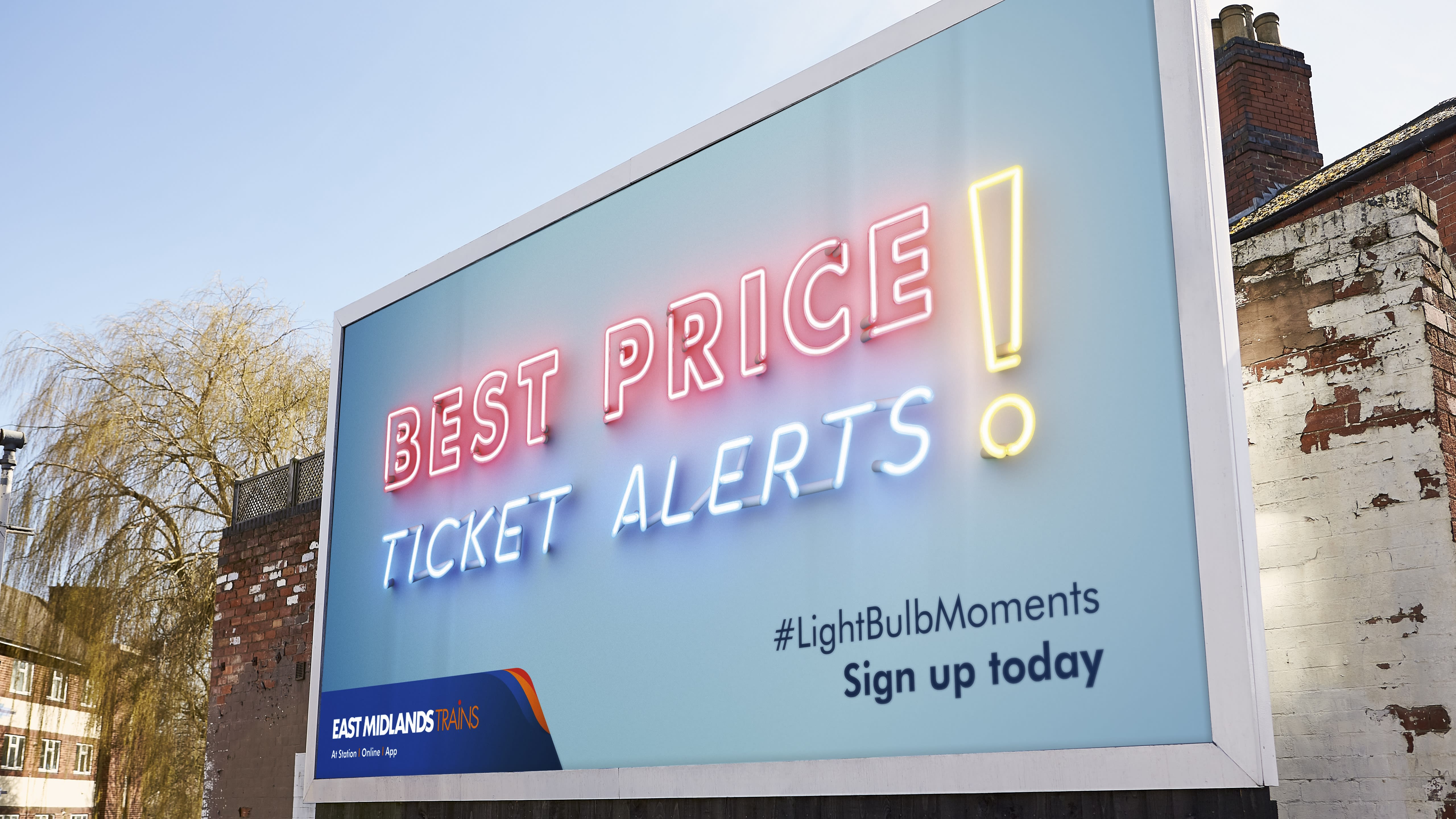 The campaign is creatively disruptive, with a dynamic digital delivery system for personalisation of messages. Our campaign features in all media channels from TV, VOD and radio to outdoor, dynamic digital and at stations. The advert featured as one of Creativebrief.com’s ‘Hot Picks’, and the campaign produced great results for East Midland’s Trains with a 74% increase in ticket alert sign ups, and a 9% increase in ticket sales via the EMT app.
