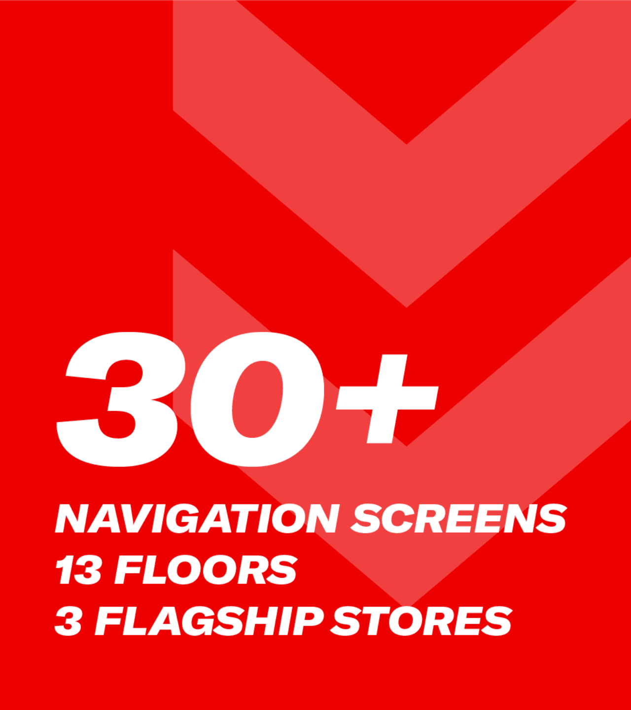 With 30+ Digital Navigation Screens over 13 floors, across 3 flagships. Digital Navigation effectively increases customer engagement and adds to the aesthetic and intrigue of the stores interior design whilst improving the flow of footfall throughout the store.