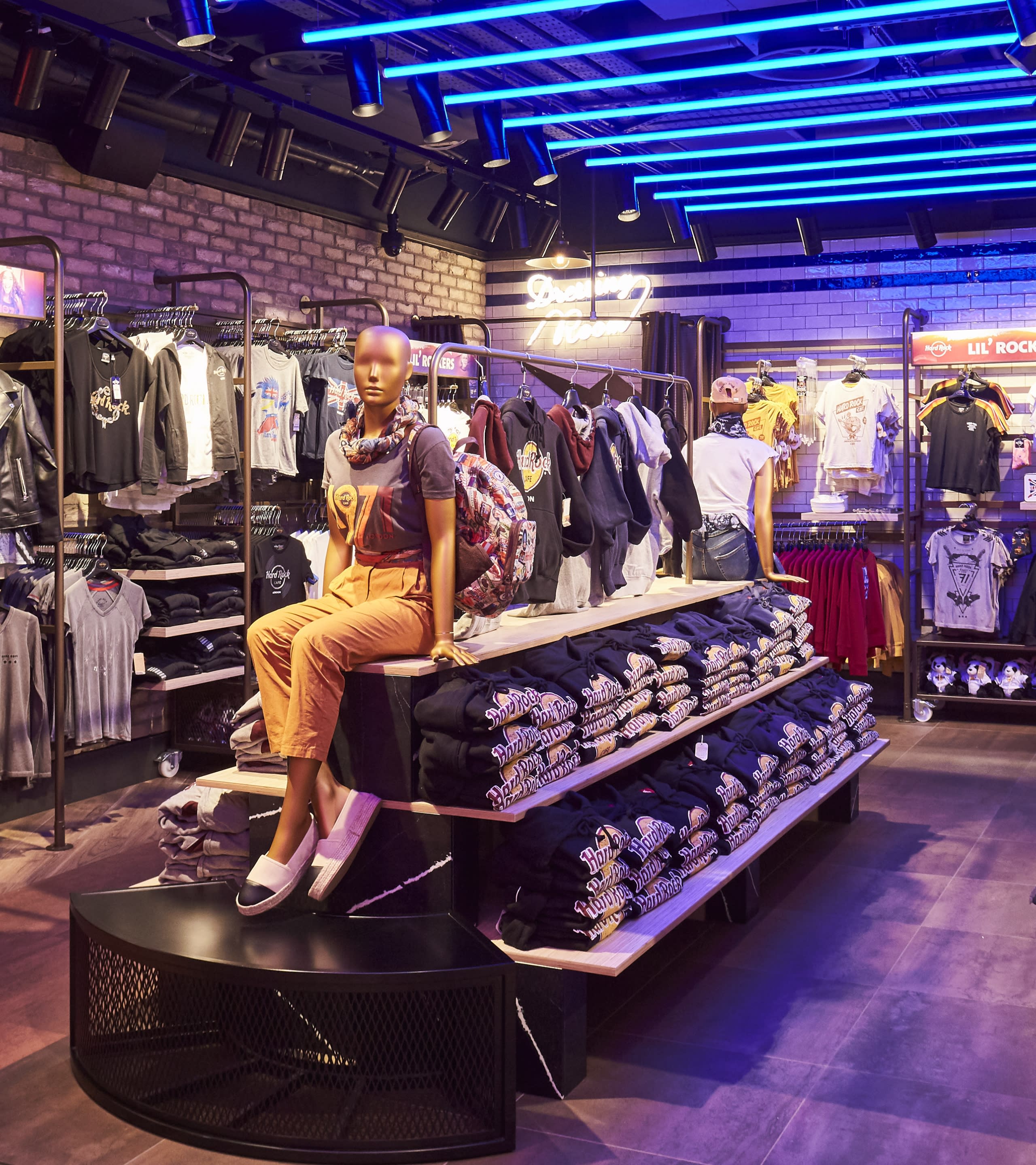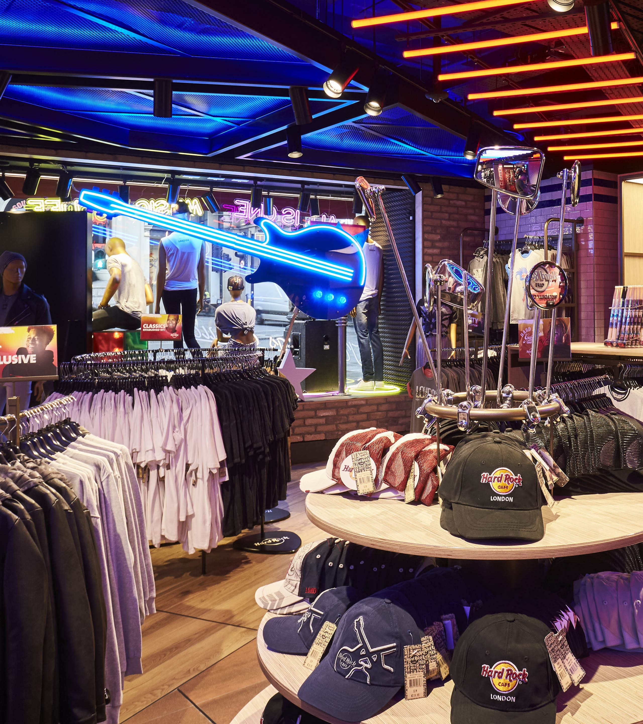 Theatrical lighting sets the scene for the retail shop. We used authentic materials and finishes from the music venues of London. The fixture landscape incorporates rock and roll details from oversized plectrums to amp cables. There is a T-shirt bar built around Hard Rock’s bestselling tees. Custom graphics layer into the space using digital, painted and neon signage.
