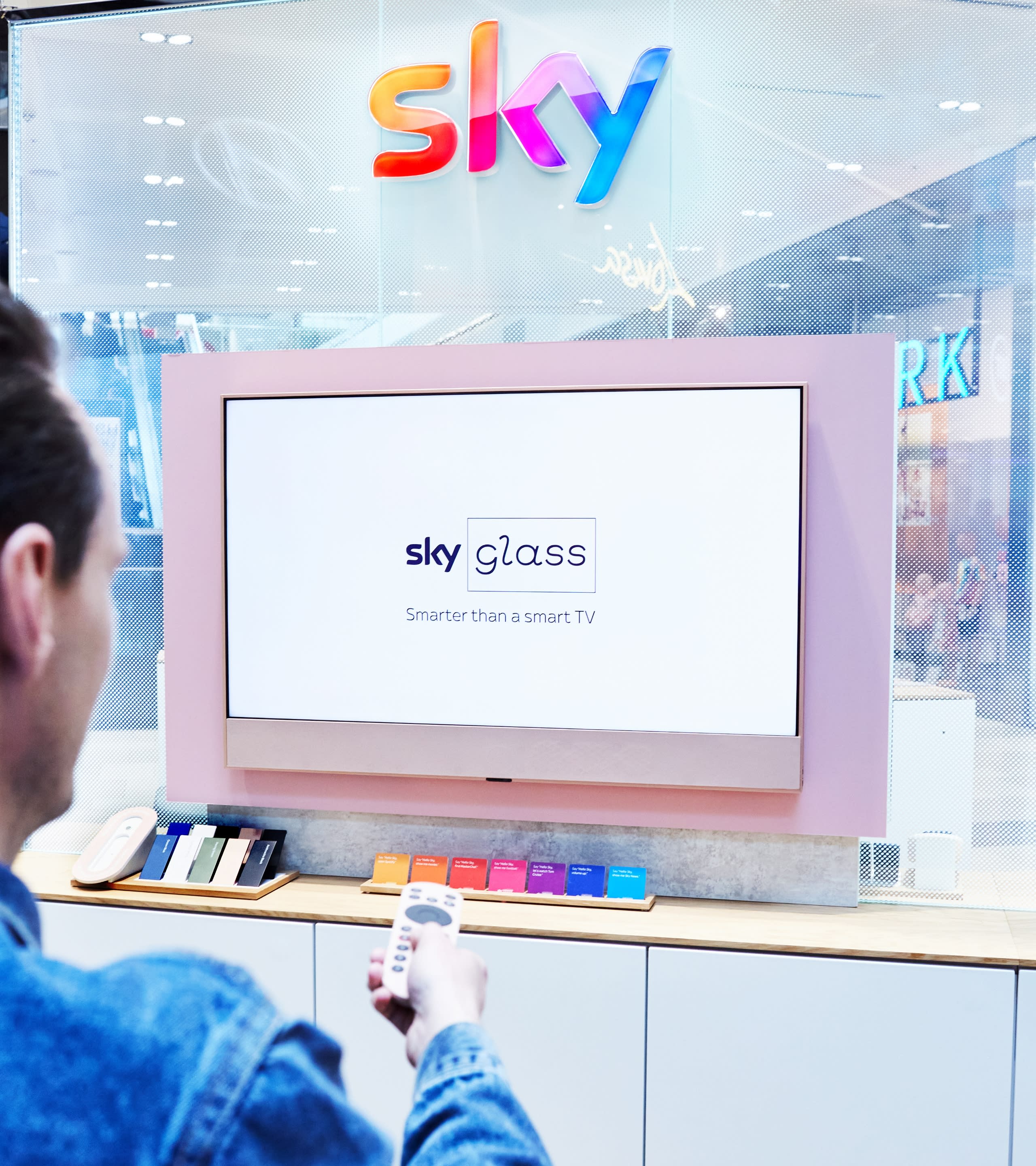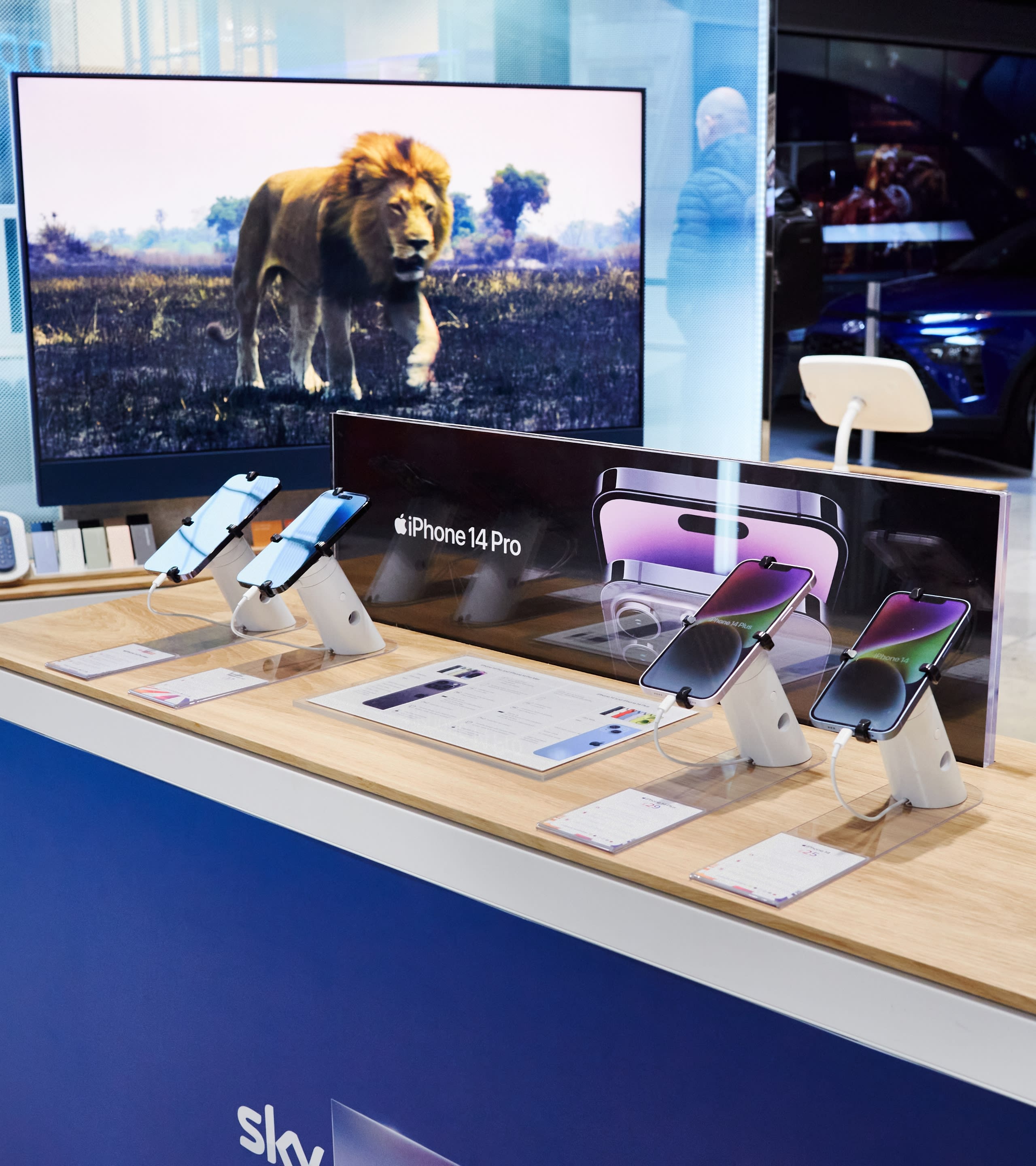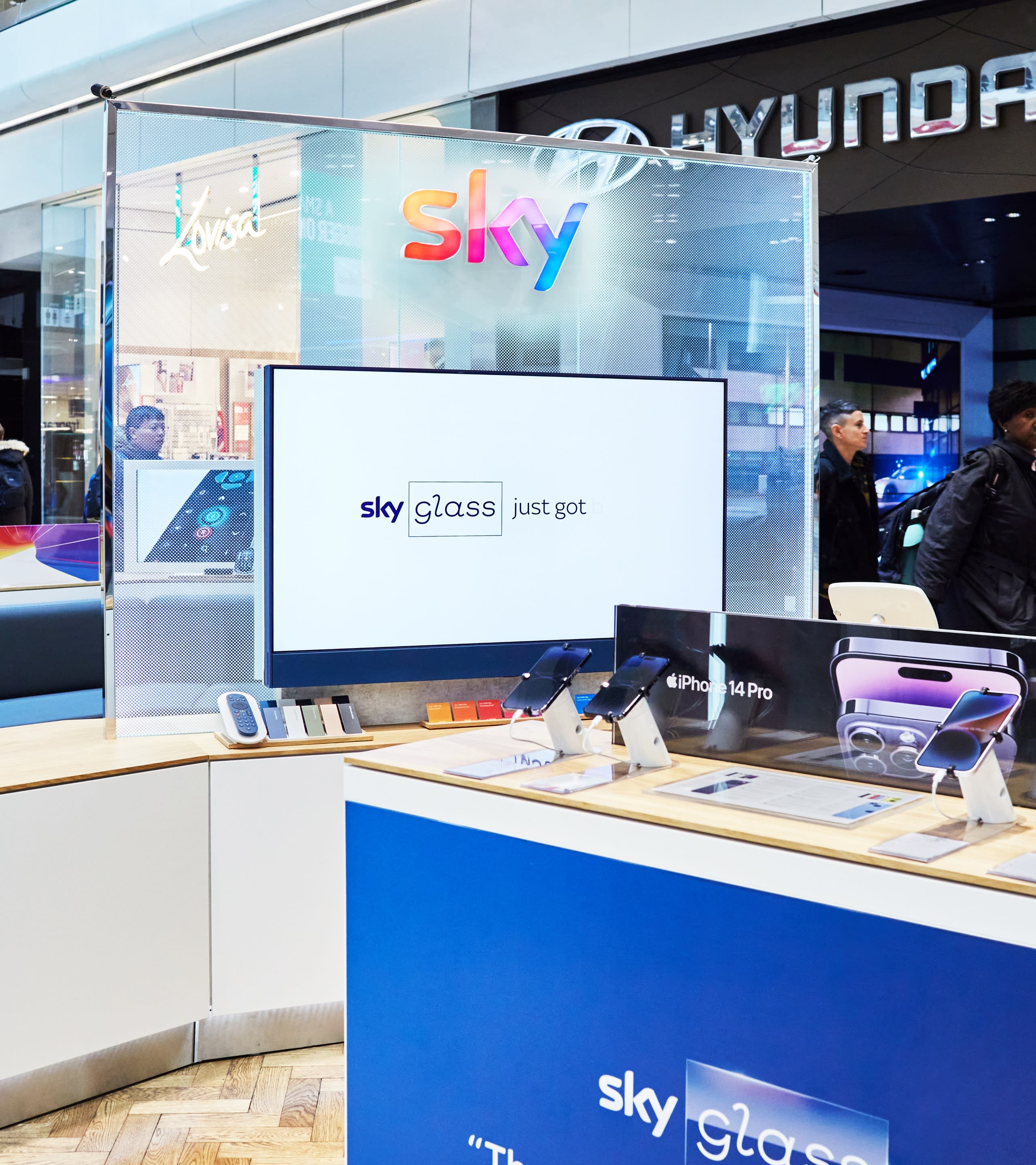 Sky have long needed the ability to create competitive sales opportunities for their content packages mid-mall, so when Sky Glass – their bestselling TV – was launched, the mid-mall concept needed adapting to showcase their hero product whilst simultaneously giving space to mobile devices from Apple and Samsung on the perimeter. As part of our ongoing work with Sky, we were asked to revive the previous NextGen design to achieve a new, innovative solution for customers to understand the premium value of Sky as a brand.