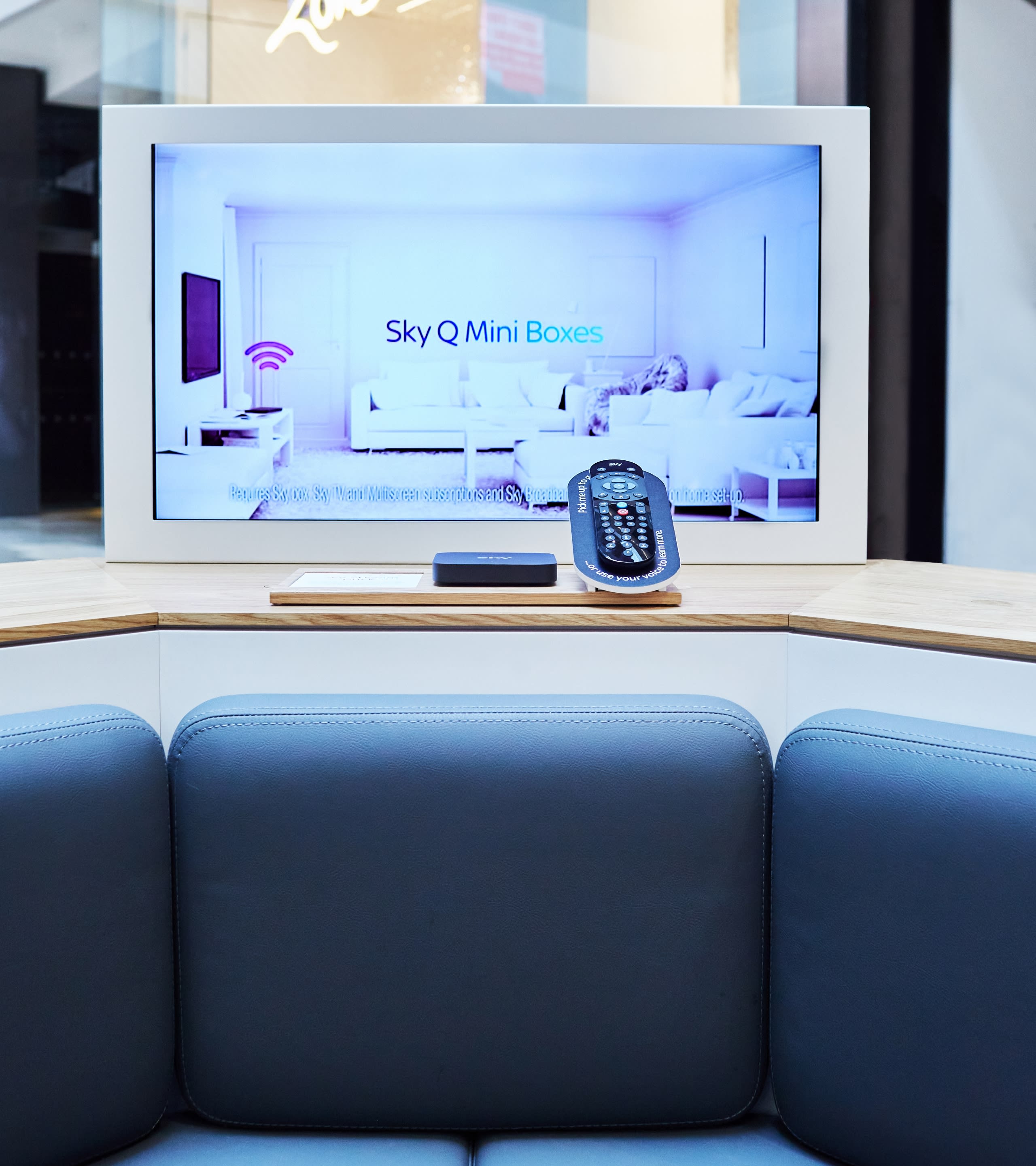 Symmetry and detailing was incredibly important to create an attractive and approachable design from all angles. It was crucial that each surface felt premium. The use of timber surfaces with clean fit-for-purpose merchandising slots gives a warm domestic touch. The now classic Sky kiosk design statement of angling the illuminated glass fin has been amplified with a frame of polished metal and large spaces for Sky Glass TVs. Sofas cocoon the customer and give a prime viewing experience showcasing Sky Glass at its very best.