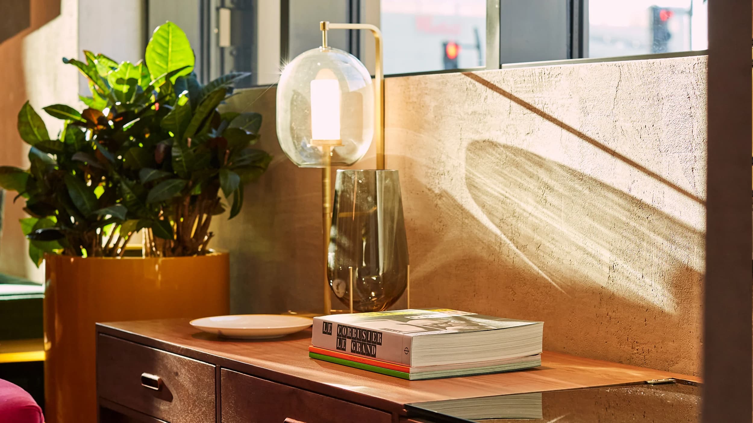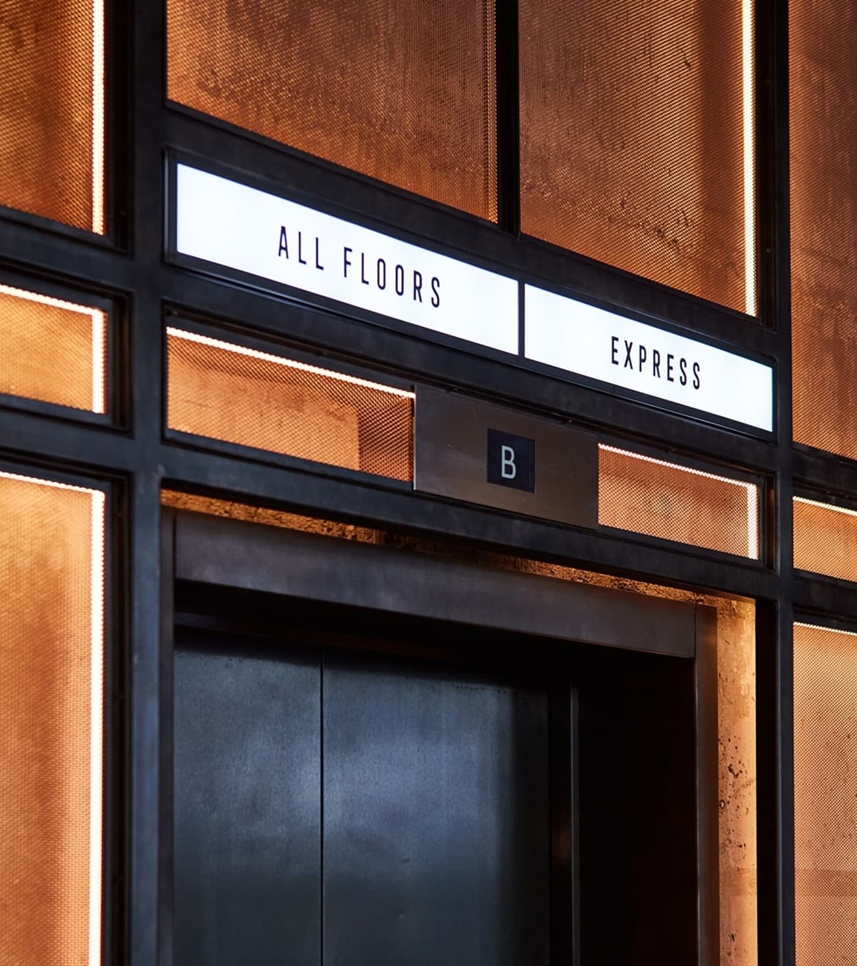 Raw concrete, aged copper, and fluted glass form the material palette, whilst the lobby showcases the building’s structure with an illuminated mesh overlay on the raw concrete walls. Industrial elements highlight the contrasting textures. The mid-century furniture style is juxtaposed with contemporary art, accessories and books to celebrate both the past and the future. Repurposed materials, like a recycled leather feature wall, add character.